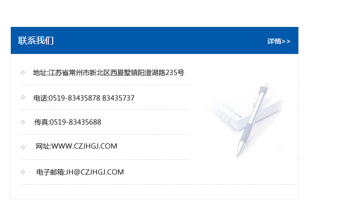 傳真:0519-83435688    郵編:213135    網址:WWW.czjhgj_com.nbzcjx.com    電子郵箱:JH@czjhgj_com.nbzcjx.com